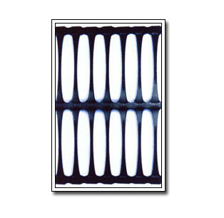 單向拉伸的土工格柵是由高分子聚合物經(jīng)擠出壓成薄板再沖規(guī)則孔網(wǎng),然后縱向拉伸而成。這種過程中使高分子成定向線性狀態(tài)并形成分布均勻、節(jié)點強度高的長橢圓形網(wǎng)狀整體性結(jié)構(gòu)。此種結(jié)構(gòu)具有相當高的拉伸強度和拉伸模量,特別是我公司此類產(chǎn)品更具有高水平的高早期(伸長率在2%—5%)拉伸強度和拉伸模量。給土壤提供了理想的力的承擔和擴散的連鎖系統(tǒng)。該產(chǎn)品拉伸強度大(>150Mpa),適應(yīng)各種土壤,是目前廣為采用的加筋加固材料。